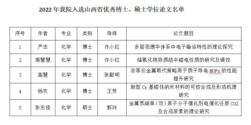 近日,山西省学位委员会、山西省教育厅公布了2022年度山西省优秀博士硕士学位论文评选结果,新葡的京官网5篇研究生学位论文入选。其中优秀博士学位论文4篇,优秀硕士学位论文1篇。新葡的京官网研究生培养始终坚持以质量为中心,严格把好学位授予环节各个关口,取得了又一丰硕成果。这是对新葡的京官网学生刻苦钻研、老师悉心指导的鼓励与肯定,也是对新葡的京官网其他在学同学的鼓励和鞭策。