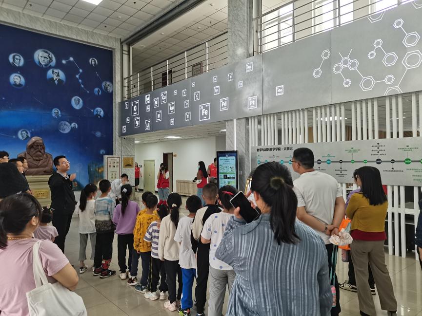 活动开始前,周国伟老师先向来访的学生和家长详细介绍了代表着化学发展史上重大里程碑事件的星空墙面以及学院学科、重点实验室的发展历程。在磁性分子与磁信息材料重点实验室,周国伟老师带领小学生们参观了先进的大型科研设备,讲解了磁性材料的研发过程及最终用途,小朋友们化身为可爱的“问题宝宝“,连连追问“这是为什么呀”、“仪器这个位置为什么要用铝箔纸包起来呀”。此外,实验室李栋老师还向小朋友们演示了永磁体磁力随温度的变化现象,引得小朋友们惊呼“加热以后磁铁的磁性真的消失了耶”。