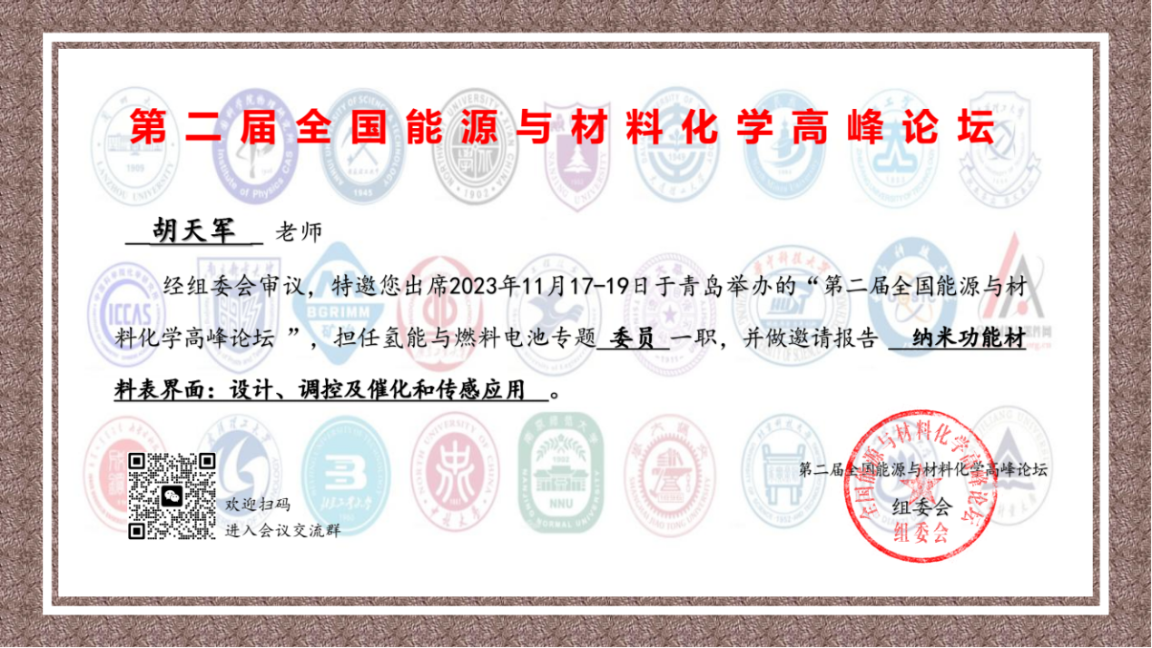 “2023 第二届全国能源与材料化学高峰论坛”于2023年11月17日-19日在青岛召开。新葡的京官网胡天军副教授应邀参加此次会议,作《纳米功能材料表界面:设计、调控及催化和传感应用》报告,报告结束后与参会专家进行了深入学术交流。